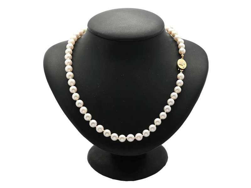 PÄRLCOLLIER, odlade pärlor ca 7-7,5 mm, lås i 18K guld, längd 48 cm, vikt 33,9 g, låset med gravyr.