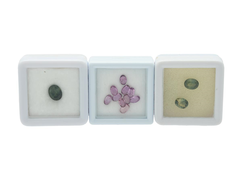 SAFIRER, 13 st, gröna och rosa, ovalslipade 5,99 ctv, nagg och skador.