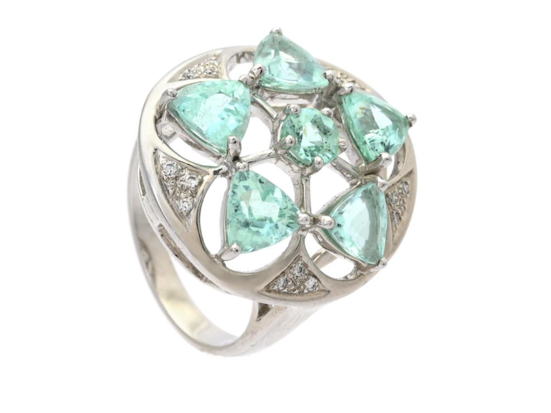 RING, ca 16K vitguld, troligen ljusblå turmalin så kallad Paraiba, 15 briljantslipade diamanter ca 0,12 ctv, ca TW/VS-SI, stl 17,5 mm, vikt 10,9 g.