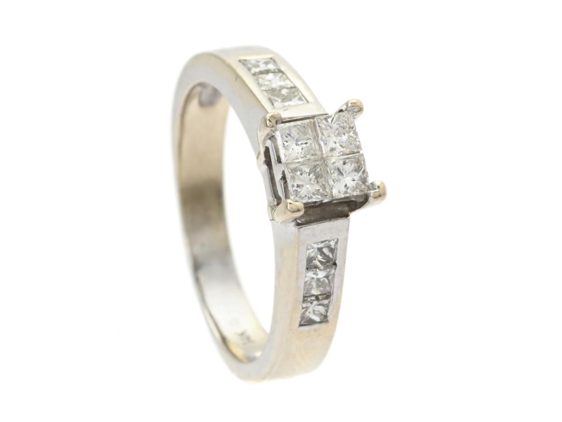 RING, 14K vitguld, 10 prinsesslipade diamanter ca 0,60 ctv, ca TW-W/VS, stl 18 mm, vikt 5,3 g.