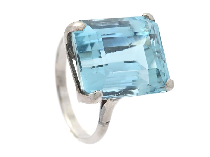 RING, 14K vitguld, smaragdslipad akvamarin ca 15,00 ct, stl 17,25 mm, vikt 7,1 g, akvamarinen med nagg, etui.