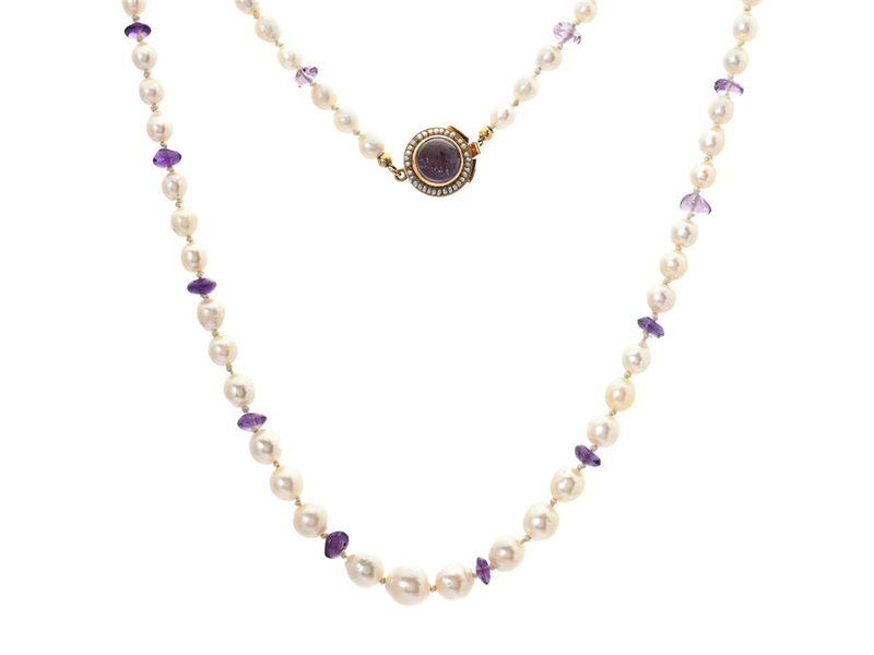ENGELBERT, pärlcollier, doserade odlade saltvattenpärlor med mellanliggade ametister, pärlor 4.3-7 mm, lås i 18K guld med cabochonslipad ametist bekransad av orientaliska pärlor, Stigbert, Stockholm 1961, längd ca 46 cm, vikt 14,4 g, slitet silke