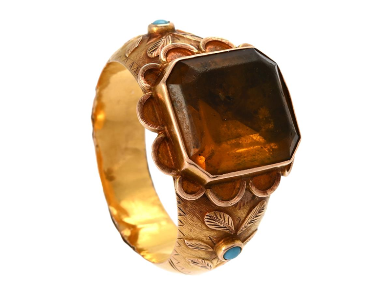 RING, 18K guld, gul folierad glassten, turkosa glasstenar, antik, Henrik Johan Törnroth, Åbo 1863, stl 19,5 mm, vikt 5,0 g, skador.