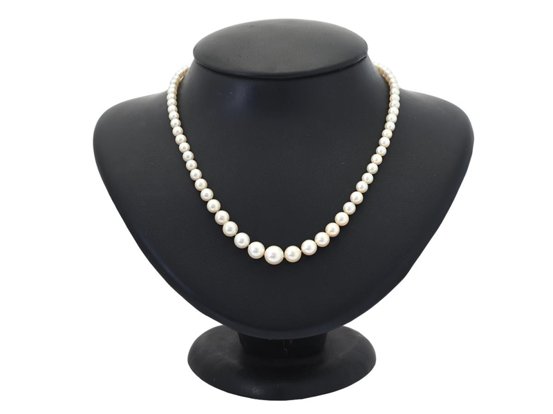PÄRLCOLLIER, odlade pärlor ca 3,3-7,9 mm, lås i 18K guld, Ceson, Göteborg 1958, längd 50 cm, vikt 14,9 g, skört silke.