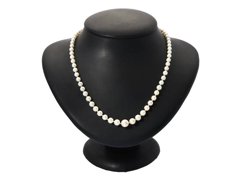 PÄRLCOLLIER, odlade pärlor, doserat, lås i silver, längd 58 cm, knutet, vikt 14,8 g.