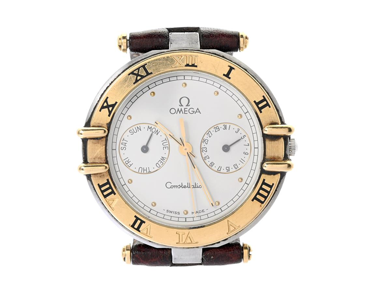 OMEGA, Constellation, s.k. "Uggla", Serie nr. 50195409, Ref nr. DB 196.1055, Boett nr. 198.0155/196.1055, herrur, 33 mm, stål/guld, quartz, safirglas, dag, datum, integrerat läderband, ca 1986, box.