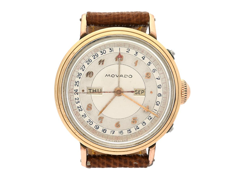 MOVADO, Calendograph, "Triple Calendar", "Francois Borgel Case", Cal 470, Boett nr. B476479 / 14849, herrur, 33 mm, guld på stål, manuell, plexiglas, dag, datum, månad, skadad urtavla, defekt (fjäder av), läderband, ca 1945.