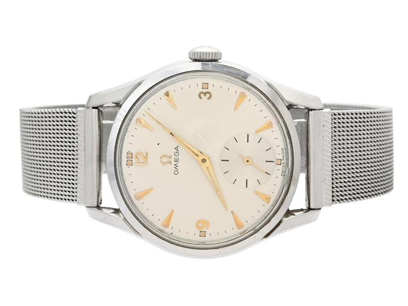 OMEGA, herrur, 36 mm, Cal 266, Serie nr. 13531079, Ref nr. CK 2639, Boett nr. 2639-13, stål (Staybrite), manuell, plexiglas (skadat), liten sekundvisare, skadad urtavla, ca 1953, metallänk ej original.