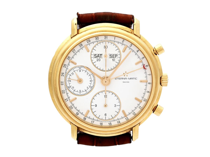 ETERNA-MATIC, Chrono-Matic (Swiss), Cal ETA 7751, Serie nr. 046, Boett nr. 678.8401.68, kronograf, herrur, 37,5 mm, 18K guld, automatisk, safirglas, dag, datum, månad, 24-timmarsvisning, läderband, ca 1992.