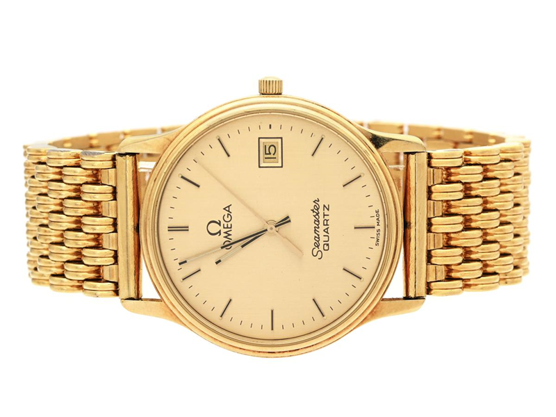 OMEGA, Seamaster, Cal 1430, Serie nr. 47636143, Ref nr. BA 196.0775, Boett nr. 196.775 BZ herrur, 32 mm, 18K guld, quartz, safirglas, datum, gravyr, ca 1985, metallänk ej original.