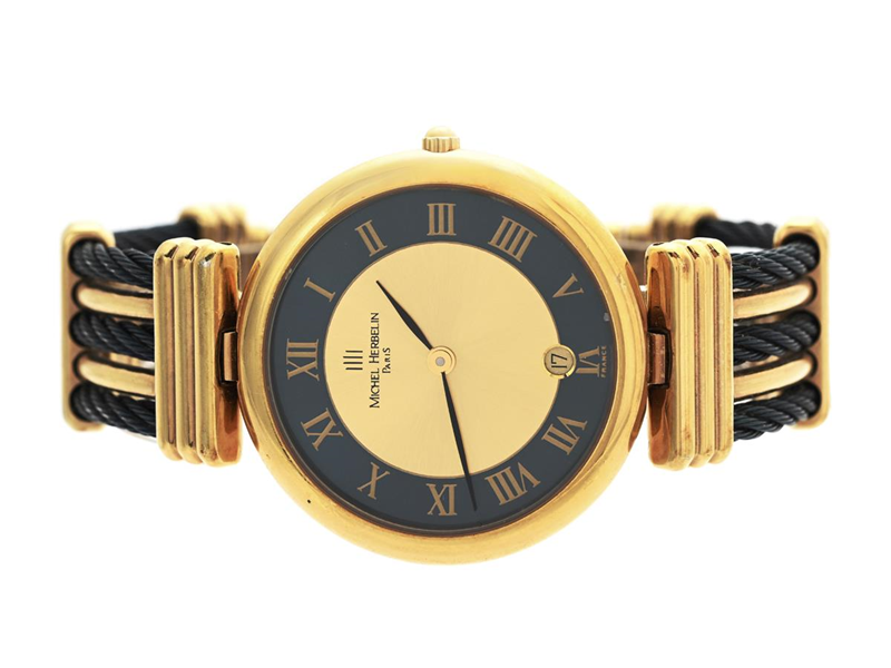 MICHEL HERBELIN, Paris, damur, 32,5 mm, Boett nr. 19420.B, doublé, quartz, mineralglas, datum, armlänk, ca 1994.