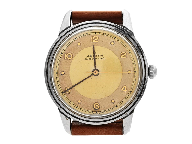 ZENITH, herrur, 35 mm, Cal 133, Serie nr. 3868469, Boett nr. 8762684, stål, hammarautomat, plexiglas, skadad urtavla/visare, defekt (servicebehov), läderband, ca 1950.