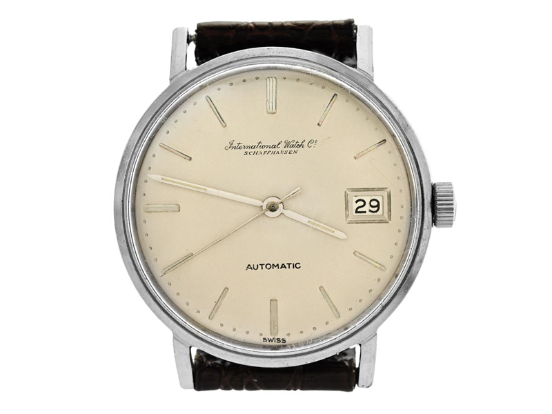 INTERNATIONAL WATCH CO, herrur, 34,5 mm, Cal 8541, Serie nr. 1731196, Boett nr. 1702216, stål, automatisk, plexiglas, datum, defekt (går ej), skadad boett (se bild), läderband, ca 1963.