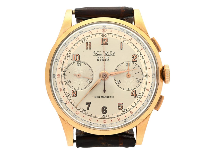DOM WATCH, Geneve, Non Magnetic, Cal Landeron 148, Boett nr. 1007 11/8506, kronograf, herrur, 37,5 mm, 18K guld, manuell, plexiglas, skadad urtavla, läderband, ca 1955.