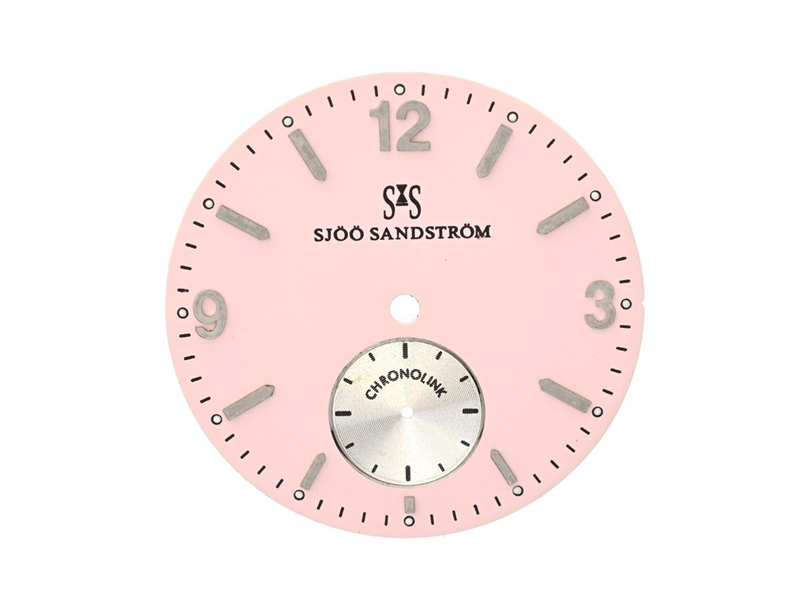 URTAVLA, till Sjöö Sandström, Chronolink, rosa/silver, liten sekundvisare.
