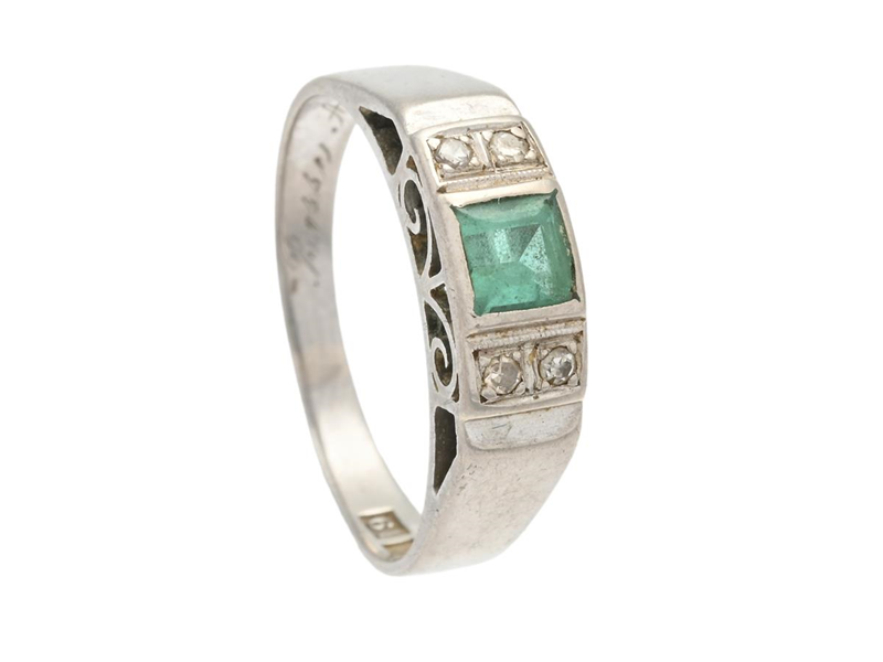 RING, 18K vitguld, grön sten, 4 åttkantslipade diamanter, strl 16,5 mm, slitna fattningar, vikt 3,6 g. gravyr.