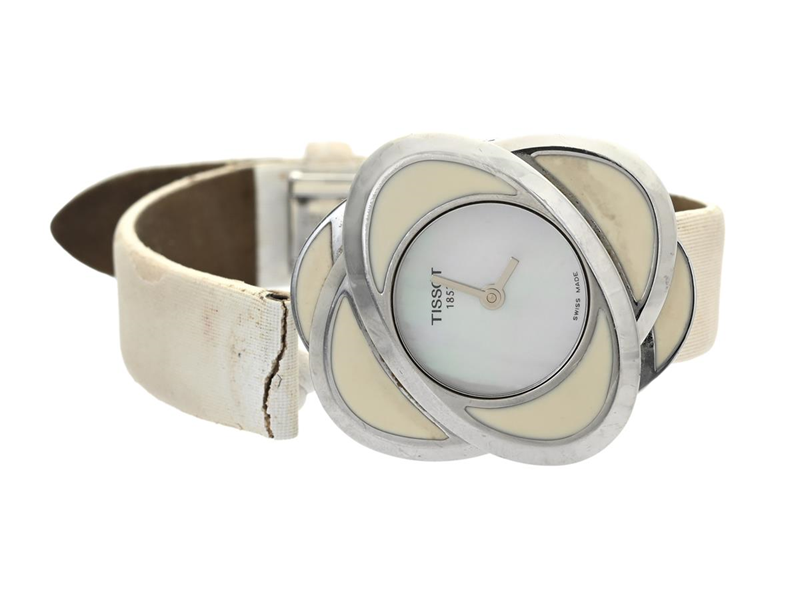 TISSOT, Precious Flower, Serie nr. TKM-BB-48076, Ref nr. T03..1.555.80, damur, 27 mm, stål, quartz, safirglas, pärlemorurtavla, läderband (skadat), viklås, cert, maj 2008, box, ytterkartong.
