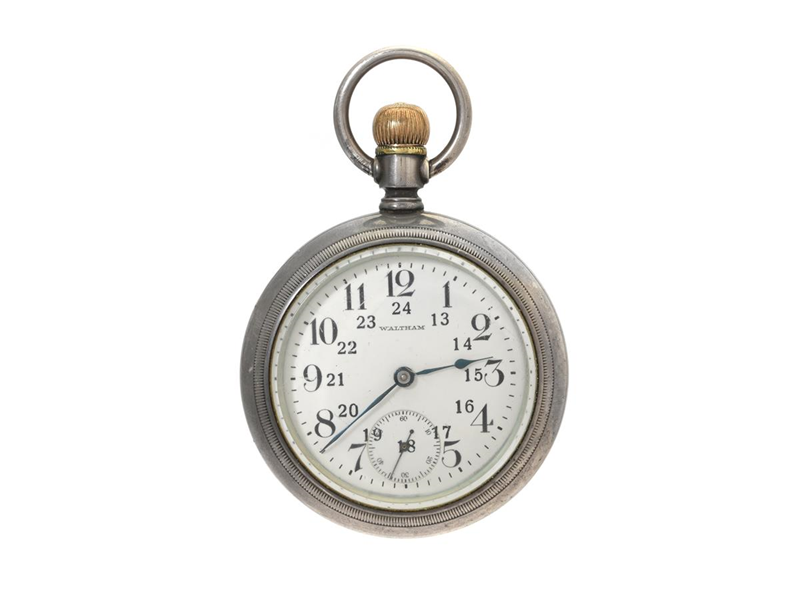 WALTHAM, fickur, 58,5 mm, Cal 818, 15 stenar, 18 size, Serie nr. 15943412, Boett nr. 184552, silver (925), ankargång, defekt, motiv (lokomotiv), ca 1907.