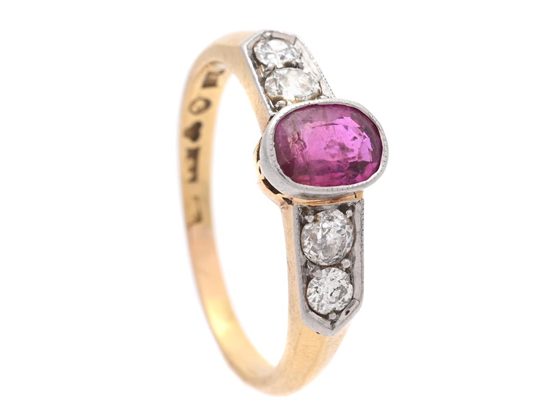 RING, 18K guld/vitguld, ovalslipad rubin, gammalslipade diamanter ca 0,30 ctv, ca W-Cr/P, storlek 17,75 mm, vikt 3,7 g.