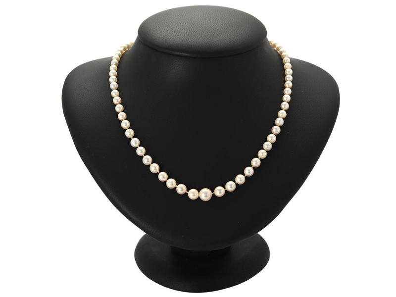 PÄRLCOLLIER, odlade pärlor ca 3,5-7,4 mm, lås i 15K guld, 8 åttkantslipade diamanter ca 0,08 ctv, odlad pärla, längd 57 cm, vikt 15,2 g, skört silke.