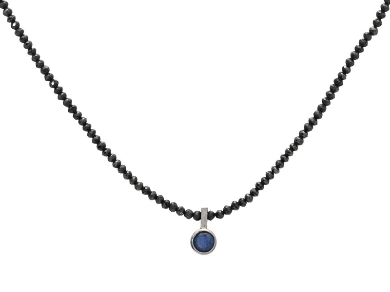 COLLIER, fasetterade svarta diamanter, hänge och lås i 18K vitguld, safir, längd 40 cm, vikt 3,6 g.