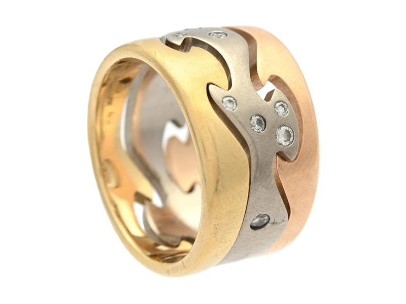 GEORG JENSEN, ring, Fusion, 3 delar, 18K trefärgat guld, 8 briljantslipade diamanter 0,16 ctv, ca TW/VS, stl 53 (ca16,75), vikt 16,5 g.