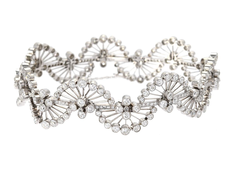 ARMBAND, platina, 266 gammal-, äldre åttkant- och rosenslipade diamanter ca 7,00 ctv, antik, tidigt 1900-tal, längd 19,5 cm, vikt 38,1 g, säkerhetskedja, enstaka diamanter har nagg och skador.