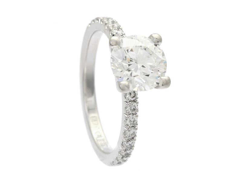RING, 18K vitguld, briljantslipad diamant 1,23 ct, TW(G)/VVS2, GIA report 6272449979, 16 briljantslipade diamanter ca 0,24 ctv, ca W/VS, Elin Petrova Design, Stockholm, stl 15 mm, vikt 2,7 g, nedslipade klor på ena sidan för att passa till alliansring.