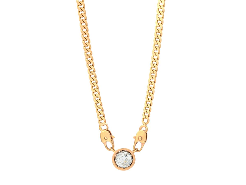 HÄNGE MED KEDJA, 18K guld, pansarlänk, gammalslipad diamant ca 1,29 ct, ca TW(F)/VVS, längd 48 cm, vikt 20,9 g, nagg vid rondisten.