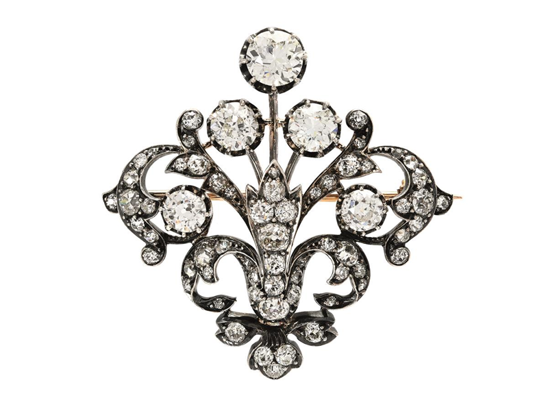 BROSCH, 18K guld/silver, 5 gammalslipade diamanter ca 4,00 ctv, ca TW-TCa(G-K)/VS2-SI2, antik- och gammalslipade diamanter ca 2,50 ctv, antik, Frankrike, sent 1800-tal, mått 45x45 mm, vikt 15,9 g, några diamanter har nagg och naturaler, etui.