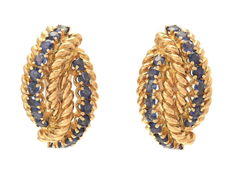 TIFFANY & CO, örhängen, 18K guld, safirer, 1970-tal, serienr 20439, höjd 25 mm, vikt 20,9 g, clips, några safirer har nagg och skador, originaletui.
