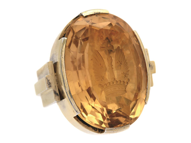 WIWEN NILSSON, sigillring, silver, delvis förgyllt, ovalslipad citrin med intaglio, signerad, Lund 1957, stl 16,75 mm, vikt 24,8 g, hjälmprydnad för friherrliga ätten Cederström. (d)
