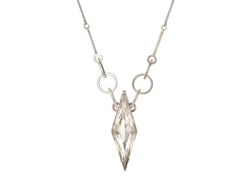 WIWEN NILSSON, collier, sterlingsilver, rombformad bergkristall, ring- och stavlänk, Lund 1942, kedjan signerad, hängets höjd 57 mm, kedjans längd 70 cm, vikt 38,5 g, bergkristallen har små nagg, mindre buckla på hänget. (d)