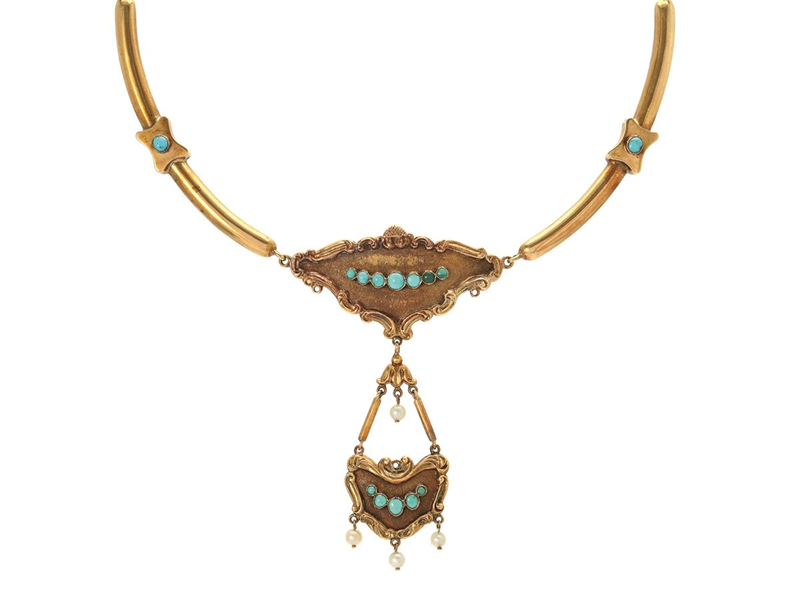 GUSTAF MÖLLENBORG, collier, 18K guld, turkoser, pärlor, antik, Stockholm 1839, längd 40 cm, vikt 25,8 g, säkerhetskedja.