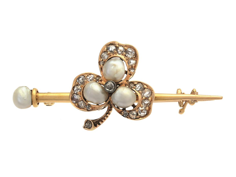 GUSTAF MÖLLENBORG, brosch, Treklöver, 18K guld, orientaliska pärlor ca 4,2-4,9 mm, rosenslipade diamanter, antik, Stockholm 1898, mått 41x17 mm, vikt 4,4 g, tennlödning, mindre skada på fästbygeln, etui.