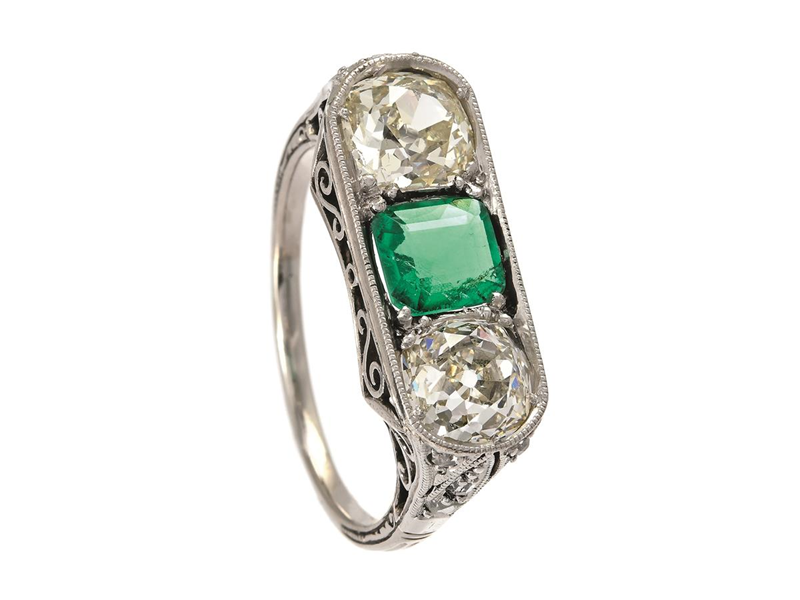 RING, platina, smaragdslipad smaragd ca 0,50 ct, antikslipade diamanter ca 1,80 ctv, ca TCa-Ca(K-M)/VS1-SI2, rosenslipade diamanter, 1900-talets första hälft, stl 17,5 mm, vikt 3,4 g, smaragden och ena diamanten har inneslutningar som når ytan, etui.