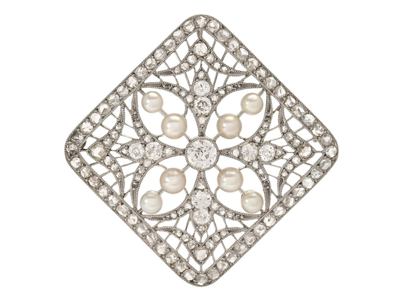 BROSCH/HÄNGE, platina, pärlor ca 2,9-3,5 mm, gammal- och rosenslipade diamanter, antik, Belle Époque, Frankrike, tidigt 1900-tal, mått 26x26 mm, vikt 9,7 g, broschnålen är löstagbar, enstaka diamanter har nagg och skador.