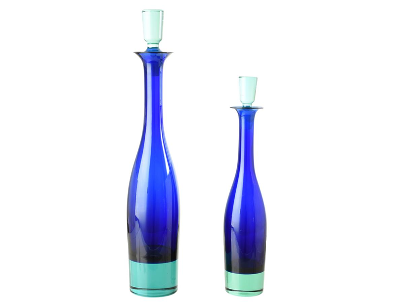 2 KARAFFER, Royal Copenhagen / Holmegaard Glasværk, Harlekin, design Anja Kjær 1994, blått grönt glas, höjd 33cm, höjd 42 cm (utan propp).