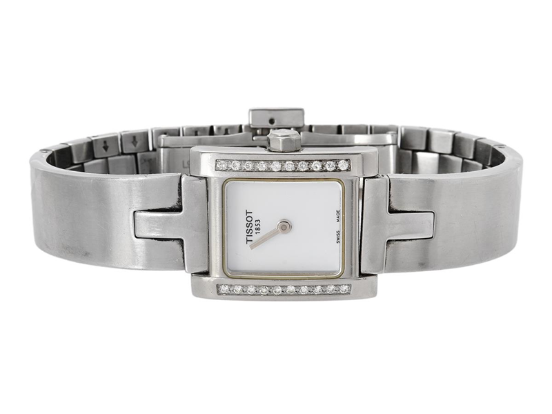 TISSOT, Lady T2, Ref nr. T62.1.195.80, Boett nr. L951K, damur, 20 x 19,5 (24,5) mm, stål, quartz (går ej), safirglas, pärlemorurtavla, briljanter på boetten (20 st. ca TW/VS, ca 0,18 ctv), originallänk, viklås, Ref nr. L950, länk 170 mm, ca 2000.