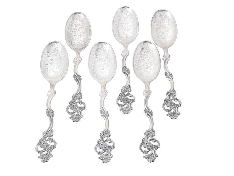 KAFFESKEDAR, 6 st, silver, mönstrat blad, blomster, längd 10,3 cm, totalvikt ca 44,9 g.