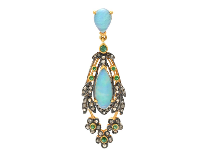 HÄNGE, 14K guld/förgyllt sterlingsilver, 2 opaler, 8 tsavoriter, 49 rosenslipade diamanter av lägre kvalité, längd 45 mm, vikt 3,4 g.