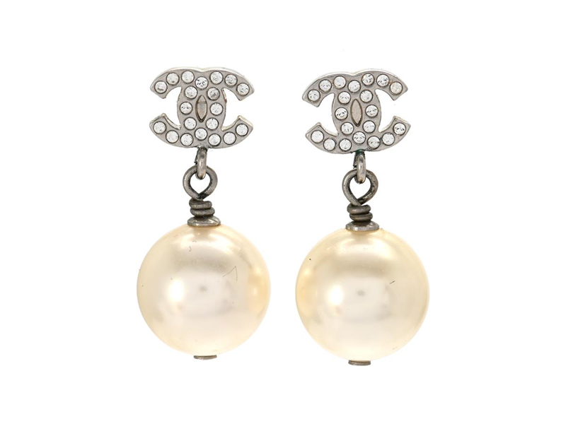 ÖRHÄNGEN, CHANEL, Logo CC, vita stenar, vit imitationspärla, stift, märkt B22 CC V år 2022, vikt 6,9 g, ask, papperspåse.