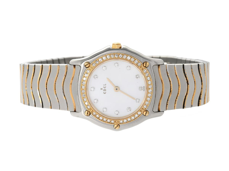 EBEL, Sport Classic Lady, Cal 81, Serie nr. 12686230, Boett nr. 181930X, damur, 27,5 mm, stål/guld, quartz, safirglas, pärlemorurtavla med diamanter (12 st. 8/8), diamantkrans (45 st. TW/VVS, ca 0,25 ctv), integrerad originallänk, viklås, Ref nr. 1093, tillverkad ca 1993, cert, april 1999, box, ytterkartong.