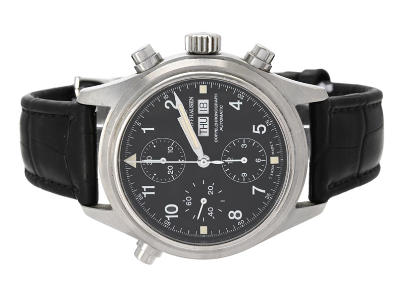 IWC, Schaffhausen Pilot´s Watch, Der Doppelchronograph (T Swiss Made T), Cal , Ref nr. 3713, Boett nr. 2768766, split-kronograf, herrur, 42 mm, stål, automatisk, safirglas, dag, datum, splittsekund, läderband, viklås, ca 1999, box (skadad), ytterkartong.