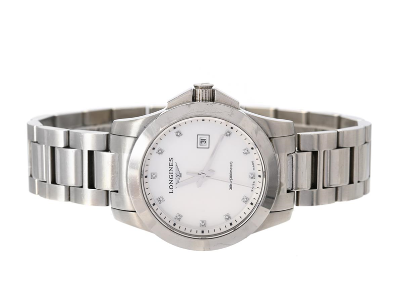 LONGINES, Conquest (30bar/300meter), Cal 250, Serie nr. 44505877, Ref nr. L3.277.4.87.6, damur, 29 mm, stål, quartz, safirglas (nagg), datum, pärlemorurtavla med diamanter (11 st. TW-F-G/VS-SI, ca 0,031 ctv) originallänk, viklås, Ref nr. L600131634 W, cert, januari 2016, box.