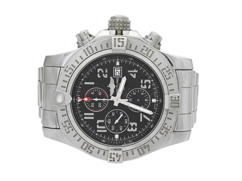 BREITLING, Super Avenger II, Chronometre, Cal 13 (ETA 7750), Verk nr. 2730309, Serie nr. 2730309, Ref nr. A1337111, Boett nr. 1214 xx, kronograf, herrur, 48 mm, stål, automatisk, safirglas, datum, skadad urtavla, defekt (akut servicebehov, se fördjupad info), Professionallänk III, viklås, Ref nr. W2814/168A, cert, februari 2015, box, ytterkartong.