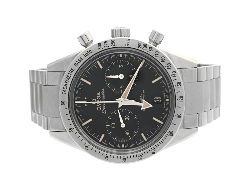 OMEGA, Speedmaster `57, Chronometer, "Tachymètre", Cal 9300, Verk nr. 86738650, Serie nr. 86738650, PIC nr. 331.10.42.51.01.002, kronograf, herrur, 41,5 mm, stål, automatisk (Co-Axial), safirglas, datum, glasbaksida, originallänk, viklås, Ref nr. STZ000824, cert, maj 2016, box (skadad), ytterkartong (skadad).