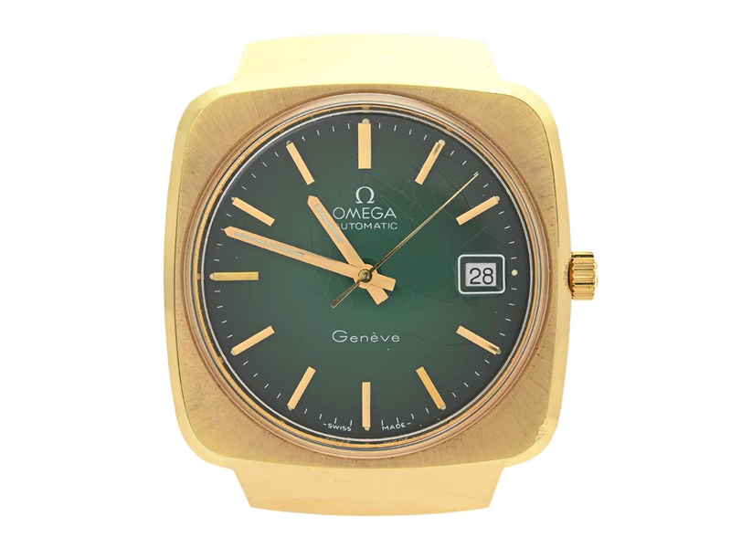 OMEGA, Genève, s.k. "Dégradé Dial", "Spider Dial", Cal 1012, Serie nr. 37249699, Ref nr. MD 166.0164, Boett nr. 166.0164 (LL), herrur, 37 x 36 (44) mm, doublé (20 micron), automatisk, plexiglas, datum, skadad urtavla, läderband, originalspänne i doublé, ca 1973.