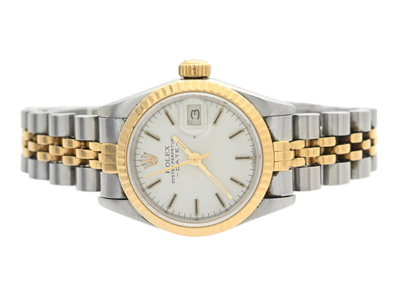 ROLEX, Oyster Perpetual, Date (-T Swiss T-), Ref nr. 69173, Serie nr. 8077175, Cal 2135, Verk nr. 004028, Boett nr. 69000A, damur, 26 mm, stål/guld, automatisk, safirglas (nagg), datum, skadad urtavla, servicebehov, Jubileelänk, viklås, Ref nr. 62523D.18-P10/468 B, ca 1983.