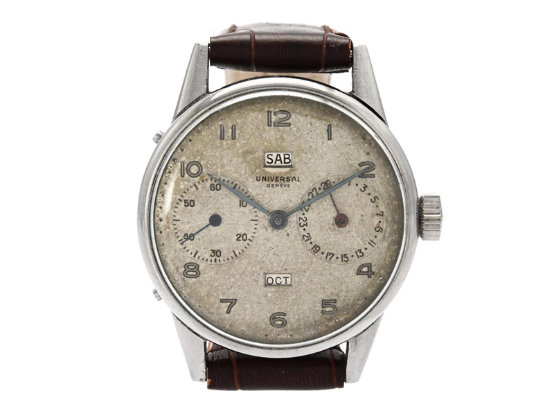 UNIVERSAL, Genève, Cal 291, Verk nr. 253437, Serie nr. 944775, Ref nr. 21301, herrur, 32 mm, stål (Enversteel), manuell, plexiglas, dag, datum, månad, skadad urtavla, defekt (går ej, akut servicebehov), läderband, ca 1942.